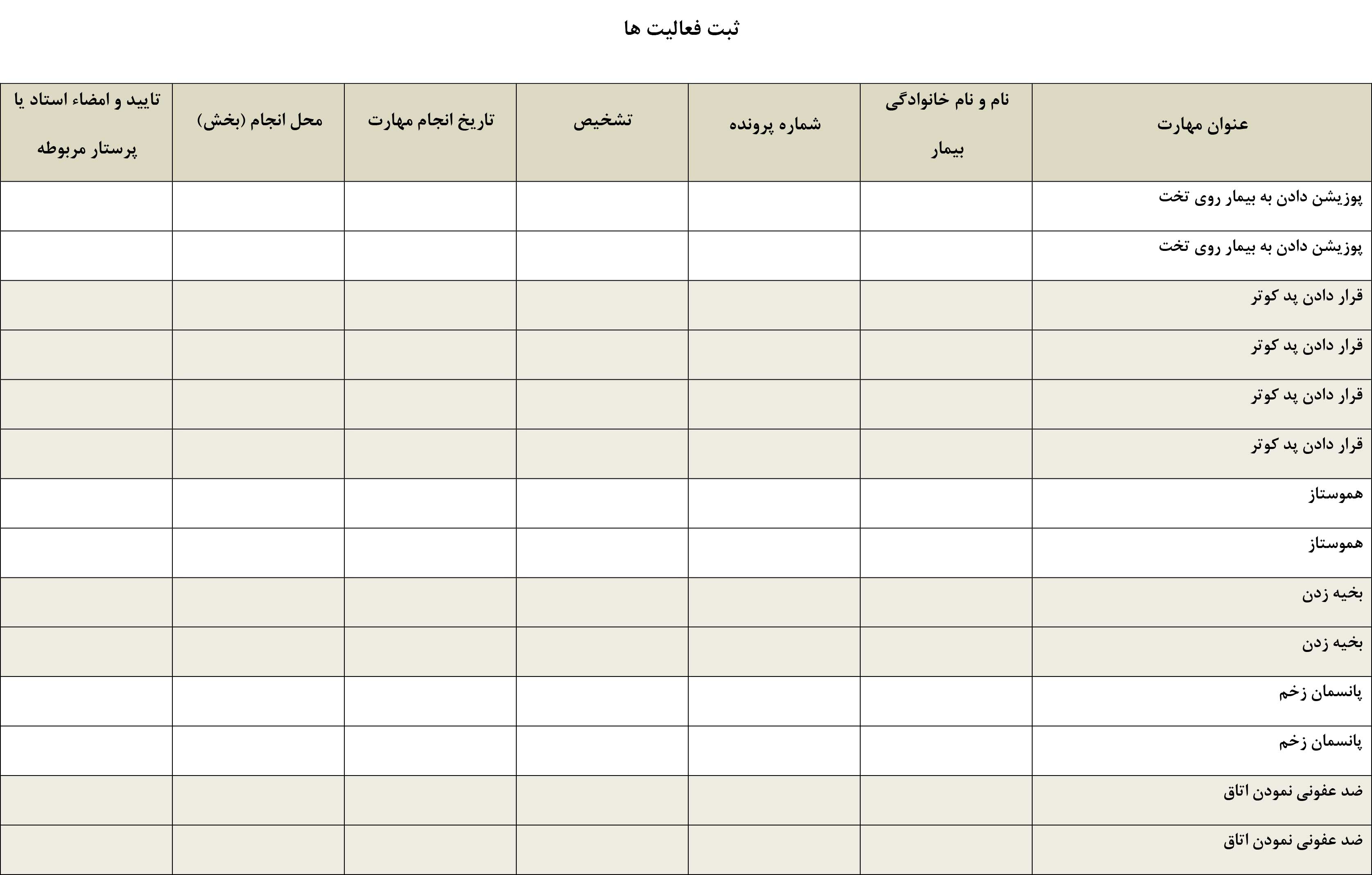 هریک از دانشجویان موظف هستند موارد آن را رعایت و مربی آن ها توسط فرم های ارزشیابی دانشجویان اتاق عمل و هوشبری مربوطی که در ادامه آمده است به پایش روزانه آن ها در جلسات کارورزی در فضای اتاق عمل و کلاس های تئوری آن ها می پردازد.