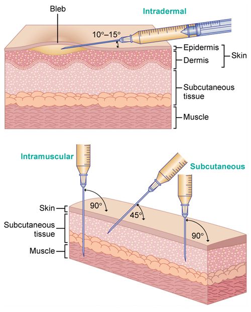 در تمامی تزريقاتی كه سوزن بهطور مايل وارد پوست میشود بايستی سوراخ سرسوزن بهطرف بالا باشد.